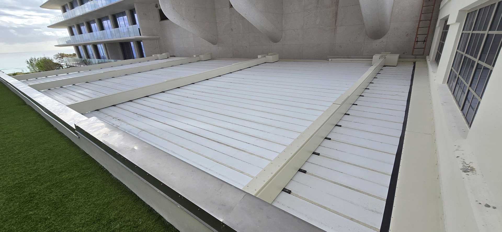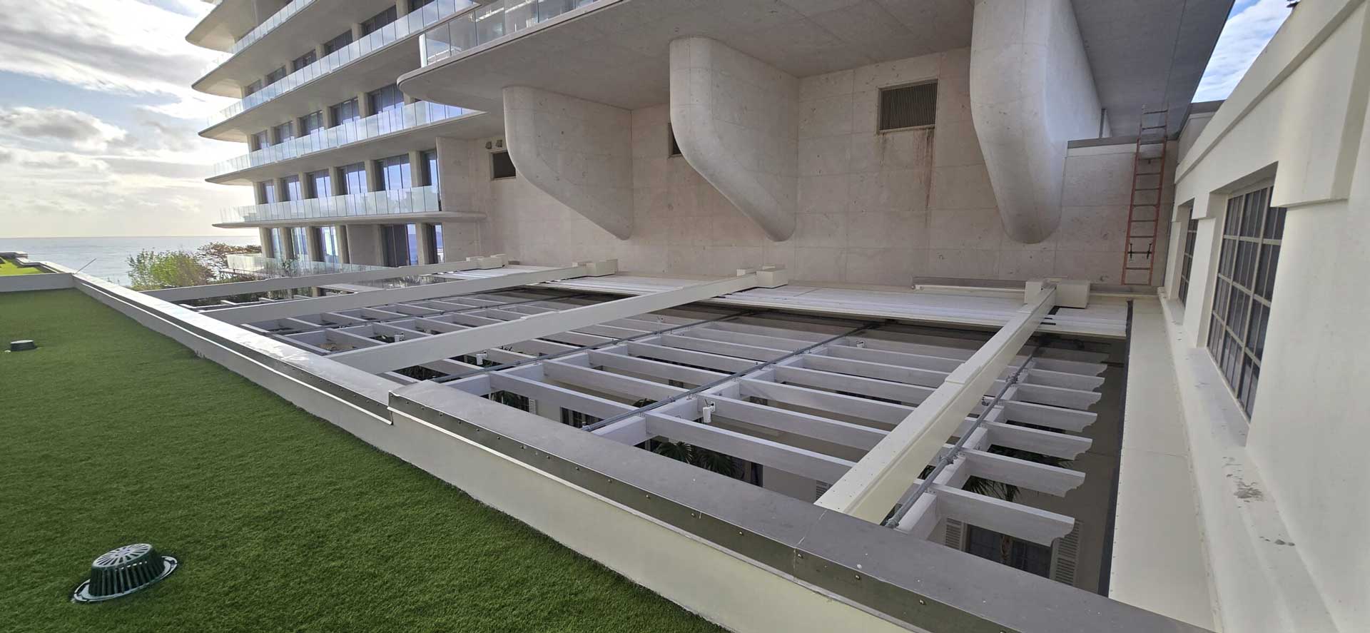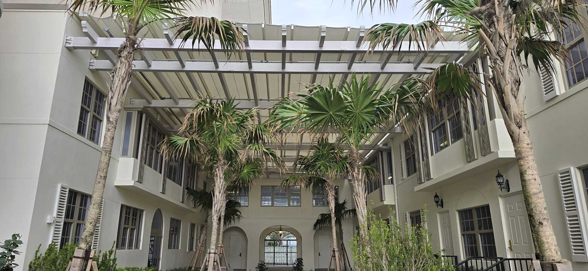 At the center courtyard of the newly designed and built Seaway Residences, part of the Four Seasons Collection, is a retractable canopy and trellis for their updated 1930’s historical-period courtyard and planned signature dining terrace. In collaboration with the Architect, Owners and our partners at Uni-Systems we designed, manufactured and installed the traditional Trellis to blend seamlessly with the space and the En-Fold® retractable canopy on top. A tricky area to work with – the entire depth of the En-Fold system and the trellis needed to fit within a narrow vertical space above sets of bay windows on the second floor and below the bottom of the window sills on the third floor. The Smart Shade Structures team also executed the installation of the En-Fold® retractable canopy. The result is a highly coordinated integration of a modern retractable canopy and old world styled trellis over the historic courtyard, beautifully done.